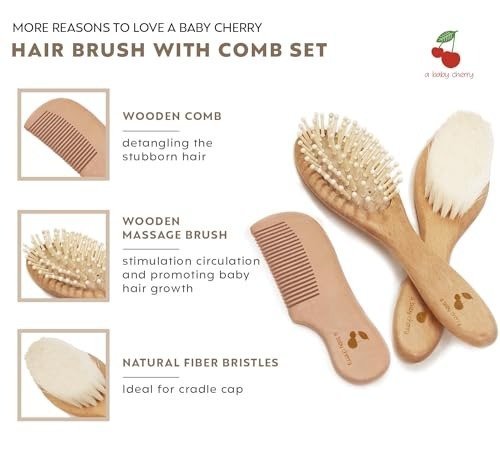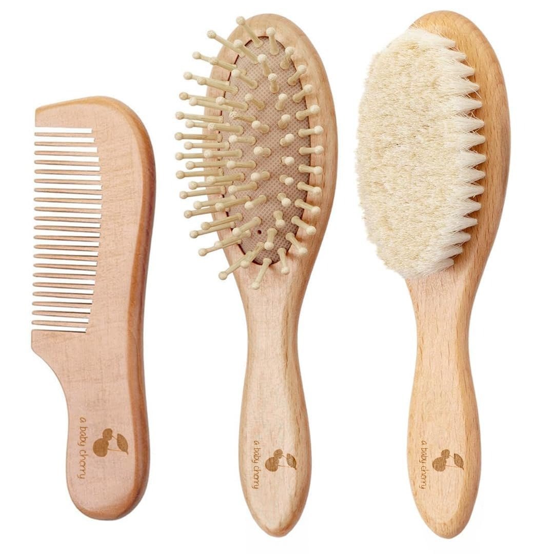 A Baby Cherry – 3 Piece Premium Baby Brush & Comb Set | Wooden Baby Comb Hair for New Born & Natural Fiber Hair Brush for Toddler – Fast Shipping to USA & Canada