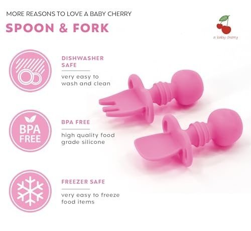 A Baby Cherry – Toddler First Training Utensil, Easy Grip Silicone Spoon & Fork for Baby Led Weaning Stage 1 || Anti-Choke Design – Fast Shipping to USA & Canada
