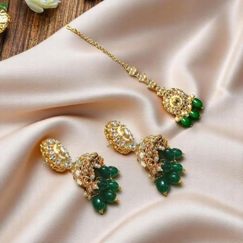 • Exquisite Artistry: Showcases a vintage gold-plated surface adorned with elaborate white kundan stones and green bead embellishments, resulting in a sophisticated ethnic statement appearance.