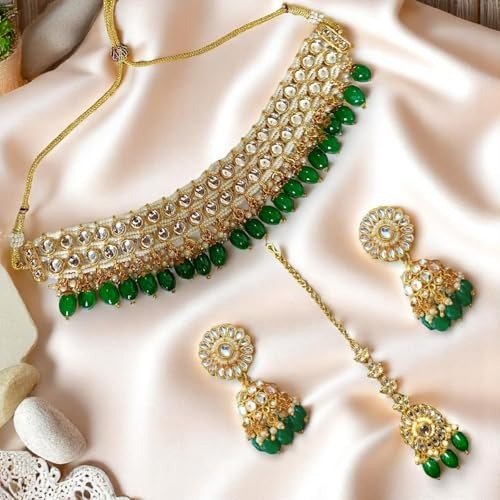 7 reviews for ACCESSHER Gold Plated Green Pearl Choker Necklace Set | Kundan Jewellery Set with Matching Jhumka Earrings | Traditional Choker Necklace for Women & Girls – Fast Shipping to USA & Canada