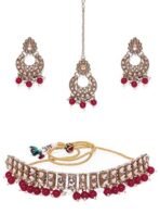 7 reviews for ACCESSHER Gold Plated Pink Sparkling Rhinestone embellished Choker Set and Beads with Earrings and maang tika for women and girls – Fast Shipping to USA & Canada
