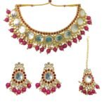 At the heart of the set lies a majestic choker necklace, meticulously handcrafted with luminous white kundan stones that exude brilliance. It is complemented by delicate beads and soft pastel hues, providing a gentle splash of color to any ensemble. The symmetrical arrangement of kundan motifs is skillfully embedded in a gold-plated alloy, bestowing the necklace with a radiant finish and a vintage ethnic appeal.