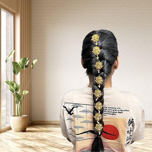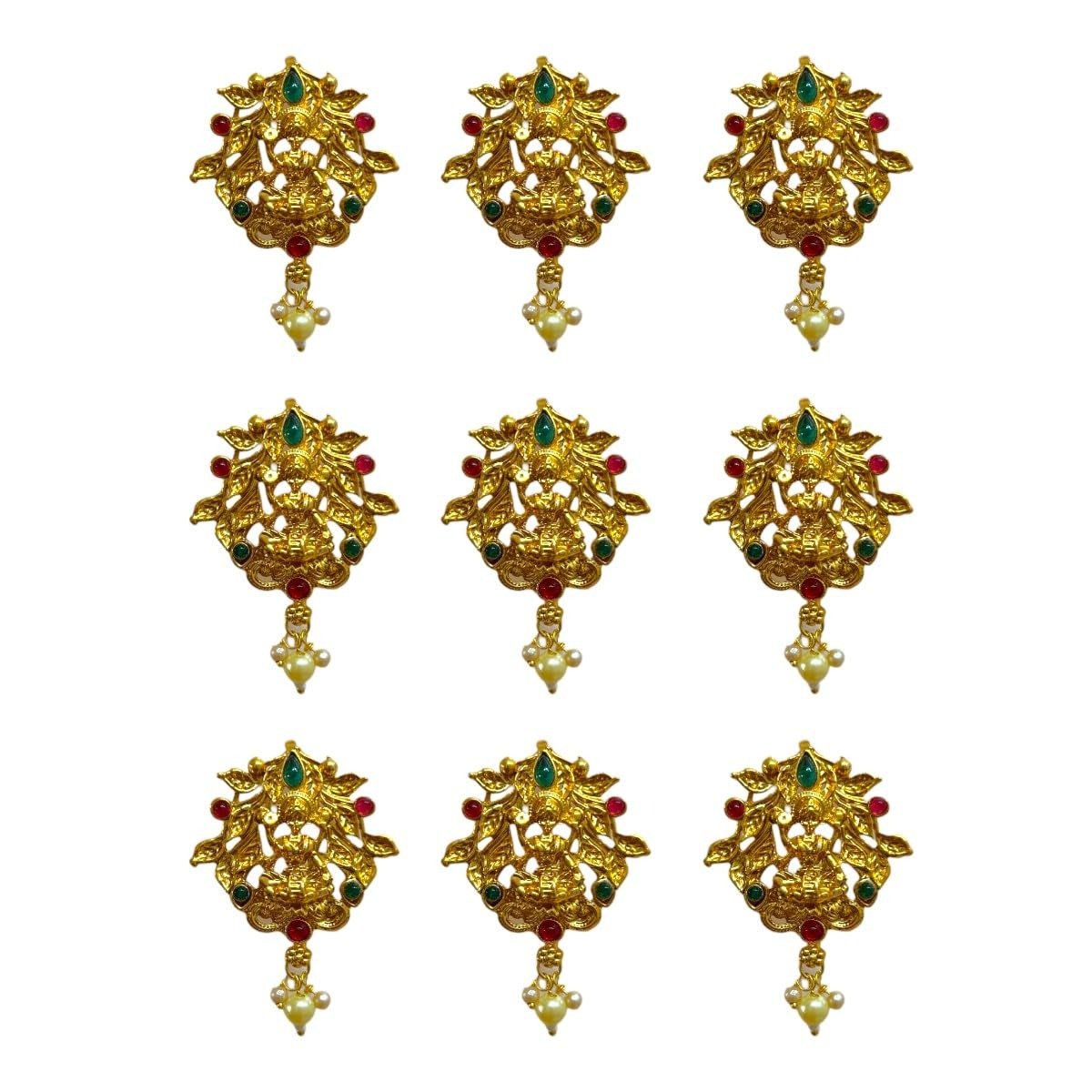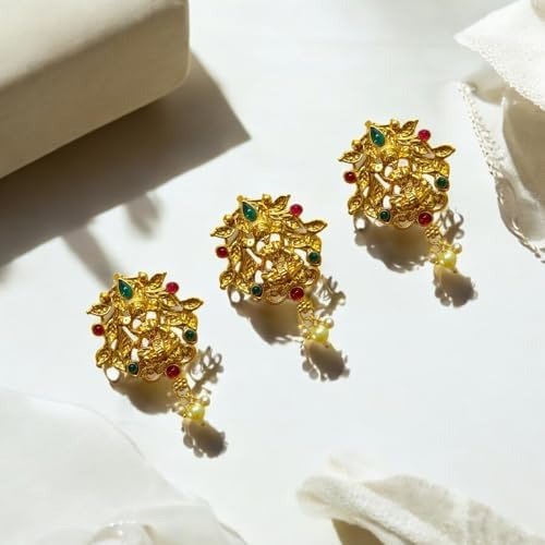 AccessHer showcases a breathtaking and elaborate creation, perfect for infusing your hairstyle with a hint of classic sophistication. Crafted for women and girls who cherish South Indian traditional adornments, this exquisite choti is gold-plated, radiating an opulent, royal allure. It boasts a captivating Mahalakshmi motif, representing affluence and abundance, embellished with vivid green and red gemstones that inject a burst of color and brilliance into your appearance. The faux pearl accents encircling the design contribute a lavish element, elevating the accessory’s overall charm.