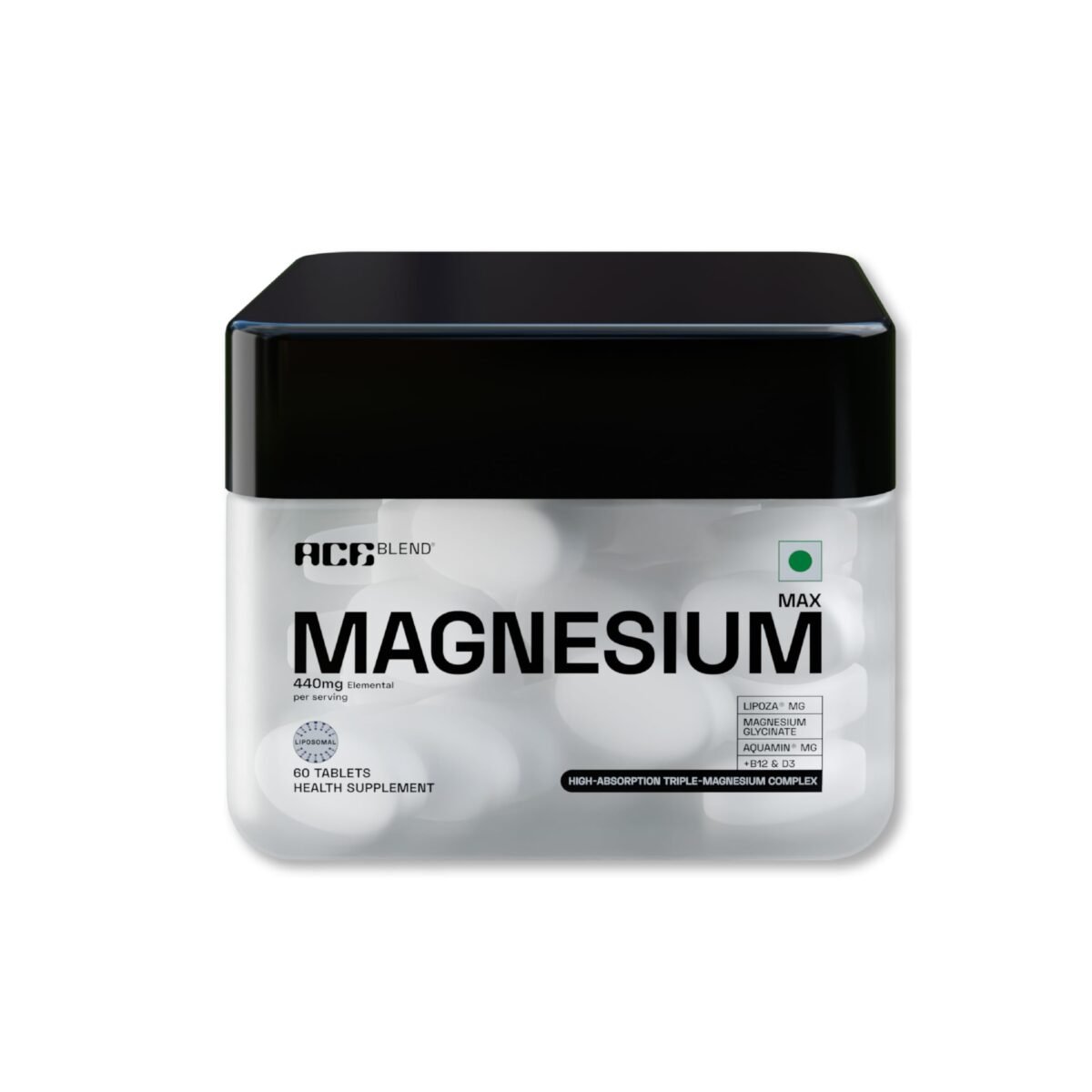 Ace Blend Max Magnesium Tablets 440mg | Magnesium Glycinate + Liposomal Lipoza? + Aquamin? | Calcium, Vitamin B12 & D3 Supplement Tablets for Men & Women | 60 Tablets – Fast Shipping to USA & Canada