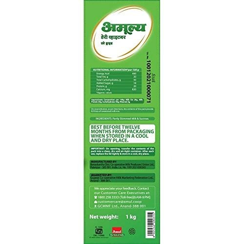 Amulya dairy whitener is rich in nutritional value. It is made from partially skimmed milk and sugar.