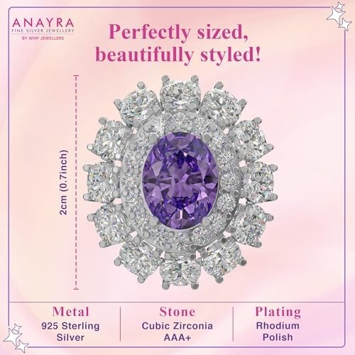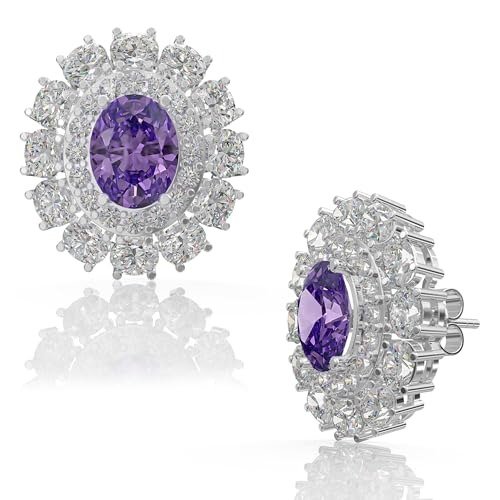 - Product Information: Presenting the Silver Oval Cut Purple Stud Earrings. The earrings measure 2cm in length. This stunning piece is carefully handcrafted from 925 Sterling Silver, finished with a rhodium polish, and adorned with AAA quality Cubic Zirconia (CZ). It is packaged in a unique and secure gift box, accompanied by a certificate of authenticity.