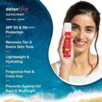 - Shield Against Sun Damage Raise a glass to your not-so-toasted self! With SPF 50 and PA++++, Detan+ Dewy Sunscreen safeguards your skin from the detrimental effects of UVA/B rays and blue light.