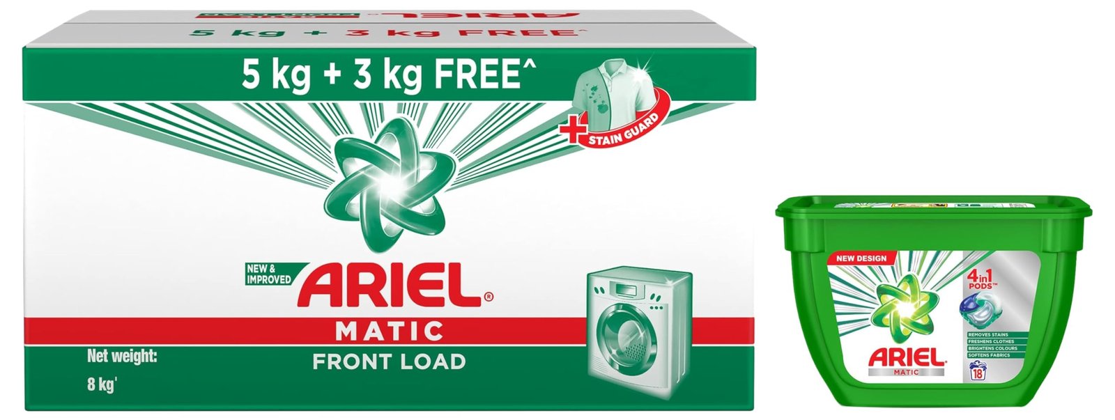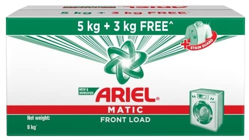 Ariel Matic Front Load Detergent Washing Powder – 5kg Plus 3kg The newly enhanced Ariel Matic delivers exceptional stain removal for a brilliantly clean finish in just one wash. Specifically crafted for top-loading machines, Ariel Matic Top Load ensures outstanding stain elimination for full loads. Its oxi-stain fighters guarantee a flawless clean, wash after wash. Additionally, it offers deep cleaning and enduring freshness. Designed exclusively for fully automatic washing machines, it produces the optimal amount of foam to ensure superior cleaning within the machine itself, preventing any damage from excessive foam. For regular loads, only one scoop is needed, while 1.5 scoops are recommended for heavier loads, combining performance with value. Ariel Matics advanced technology ensures impeccable cleaning for all your garments, effectively tackling tough stains such as juice, chocolate, tomato, and butter/ghee, while preserving the vibrancy of your clothes. Bid farewell to stains and dullness!Ariel Matic 4in1 PODs Detergent Pack 18 ct – for Top & Front Load Washing Machines Only Ariel Matic 4in1 PODs are laundry detergent pods that offer four key benefits: stain removal, clothing freshness, color brightening, and fabric softening. Each pod is designed for one wash, and the pack contains 18 pieces, suitable for both top and front load washing machines.