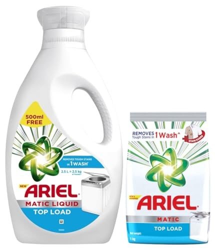 Ariel Matic Liquid Detergent for Top Load – 2 Liters + 500 Milliliters Free Ariel Matic liquid detergent effectively eliminates stubborn stains in a single wash while safeguarding your colored garments from fading. As a liquid formulation, it easily dissolves in water, ensuring your clothes retain their vibrancy without any residue. Featuring Ariel’s advanced technology, it is tough on stains yet gentle on colors, offering an ideal washing solution. Specifically crafted for front-loading fully automatic washing machines, just 1 liter of Ariel Matic liquid detergent cleans as much as 1 kilogram of powder, providing exceptional value. The innovative technology of Ariel guarantees outstanding stain removal for all fabrics, tackling even the most challenging stains like tea, coffee, chocolate, and tomato. Its specially designed cap ensures zero spillage and facilitates easy dosing, resulting in a tidy and enjoyable washing experience. Additionally, it imparts a refreshing scent that leaves your clothes smelling fresh for an extended period. Ariel Liquid is so user-friendly that anyone can achieve remarkable results, making it a perfect reason to #ShareTheLoad. Lets banish stains with every drop of Ariel Matic liquid detergent!Ariel Matic Top Load Detergent Powder – 1 kg The newly enhanced Ariel Matic delivers powerful stain removal for a brilliantly clean finish in just one wash. Tailored for use in front-loading machines, Ariel Matic Front Load ensures exceptional stain removal for full loads. The innovative Brightguard technology keeps your garments bright wash after wash. Ariel Matic powder also offers deep cleaning and enduring freshness. Specifically formulated for fully automatic washing machines, it produces the optimal amount of foam to ensure superior cleaning without harming the machine due to excessive suds. Only 1 scoop is needed for regular loads, and 1.5 scoops for heavier loads, combining performance with value. Ariel Matics state-of-the-art technology guarantees impeccable cleaning for all your clothing, effectively removing tough stains like juice, chocolate, tomato, and butter/ghee while preserving the brightness of your fabrics. Say farewell to stains and dullness!