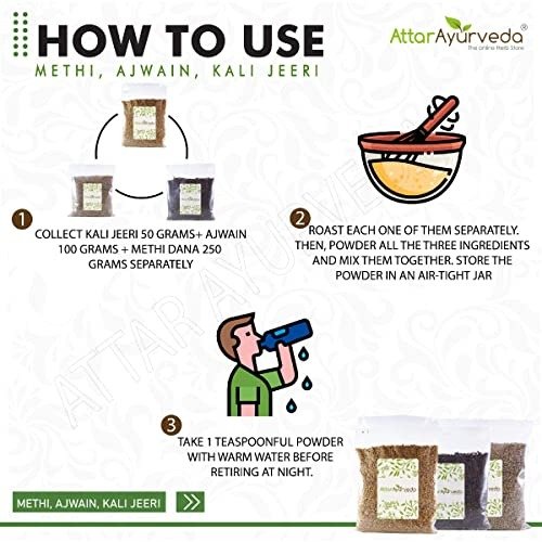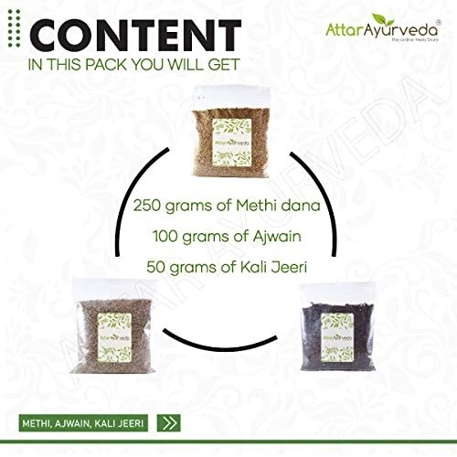 • This package includes: 250 grams of Methi seeds, 100 grams of Ajwain seeds, and 50 grams of Black Cumin.