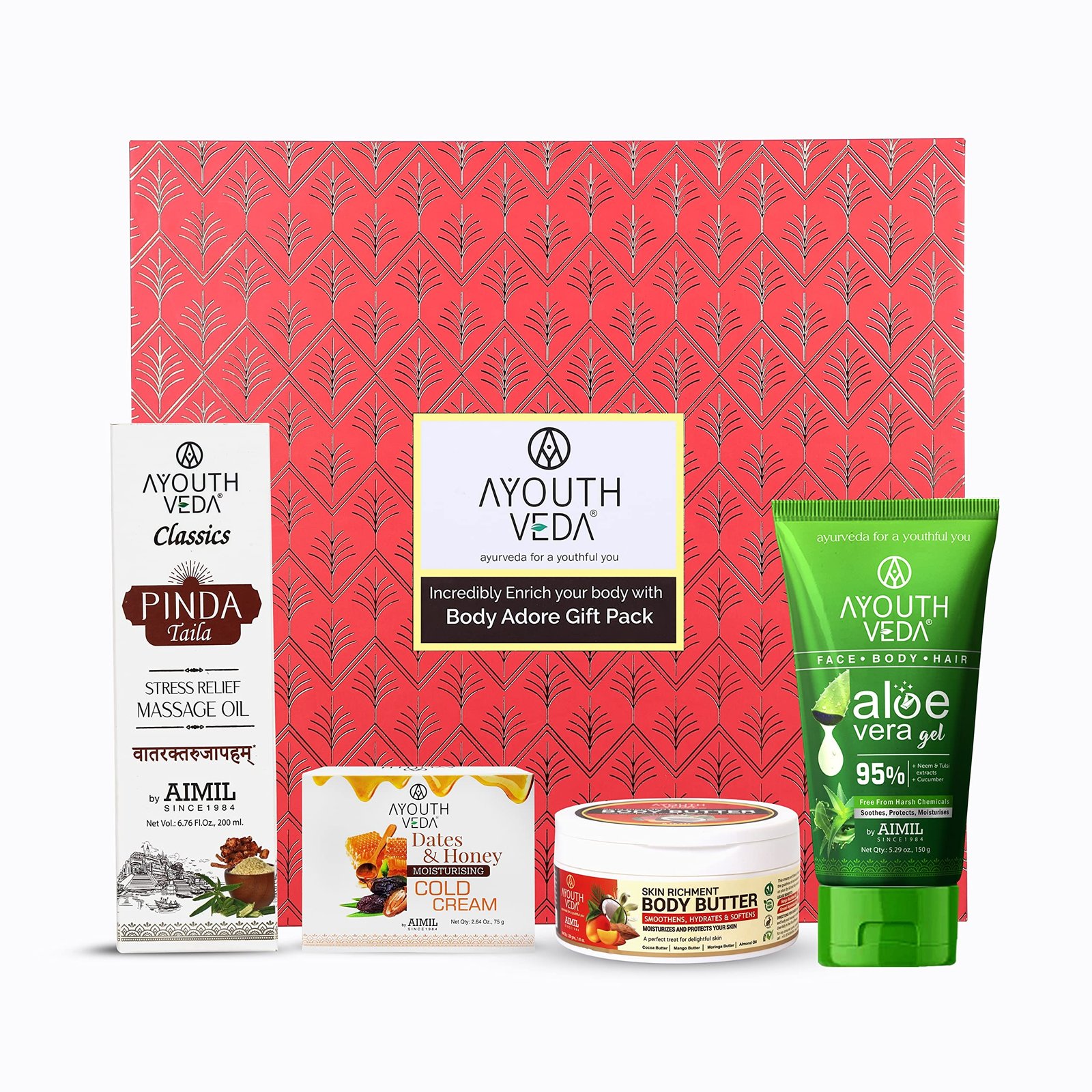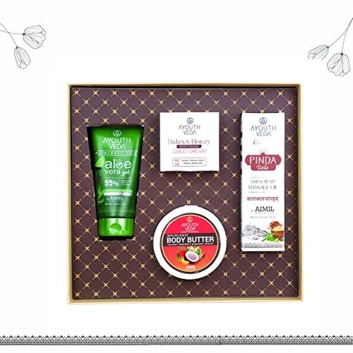 - Included in the Package: 1 x Ayouthveda Skin Richment Body Butter, 1 x Ayouthveda Aloe Vera Gel, 1 x Ayouthveda Dates & Honey Moisturizing Cold Cream, and 1 x Ayouthveda Pinda Taila.