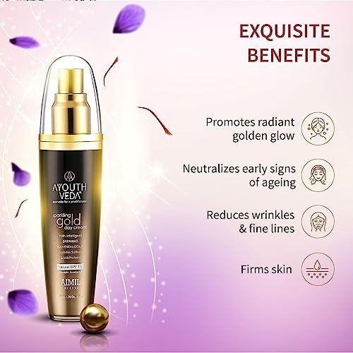 • Enhances skin elasticity, featuring genuine 1000 ng of 24k gold per ml, infused with Kashmiri saffron. This formulation is bolstered with natural SPF 15 and enriched with floral distillates, essential oils, pure milk cream (malai), and fruit extracts.