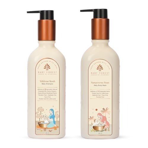 Presenting the Baby Forest Nikhrae Kesh Baby Shampoo and Sampoorna Snan Baby Body Wash, a comprehensive care pair designed for your child’s sensitive skin and hair. The Nikhrae Kesh Baby Shampoo features a protein-rich, paraben-free formulation enriched with Hibiscus leaves and the time-honored Ayurvedic herb Brahmi. This shampoo fortifies hair roots, safeguards, and hydrates the scalp, resulting in hair that is soft, lustrous, and resilient. For application, simply rub the shampoo between your palms to create a light lather, gently massage it into the scalp and hair, allow it to sit for a minute, and then rinse thoroughly with water. Next, use the Sampoorna Snan Baby Body Wash, a mild formula enriched with 10 Ayurvedic herbs and oils, including Red Sandalwood, which cleanses, moisturizes, and nourishes the skin, leaving it radiant and supple. To use, apply a small amount to your baby’s wet skin, gently massage to create a lather, and rinse thoroughly. Both products are tear-free, cruelty-free, dermatologically safe, and vegan, providing the finest natural care for your little one.