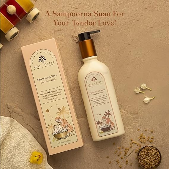 - APPLICATION INSTRUCTIONS: Dispense a small quantity of Baby Forest Sampoorna Snan Baby Body Wash onto your palm and softly massage it onto your baby’s skin. Rinse thoroughly. This product is Tear-Free, Cruelty-Free, Derma Safe, and Vegan.