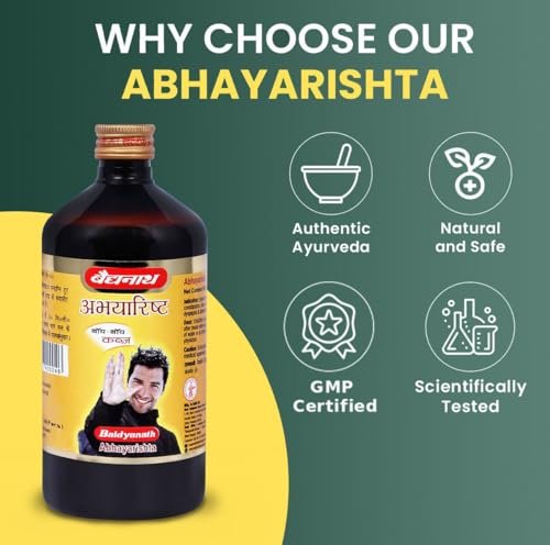 Each ingredient in this formulation is particularly beneficial for addressing common digestive issues such as indigestion, constipation, gas, abdominal bloating, piles, hard stools, abdominal pain, and flatulence, as well as aiding in the elimination of excess toxins from the stomach. In Abhayarishta, Baidyanath incorporates jaggery (Gur) as a key ingredient, renowned for its detoxifying properties and its ability to cleanse the liver by expelling harmful toxins from the body.