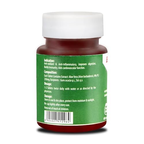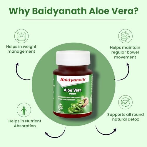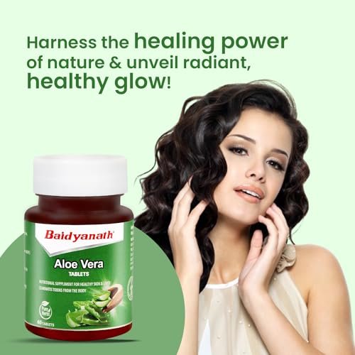 Baidyanath Aloe Vera Tablets | Nutritional Supplement for Radiant Skin and Liver Health | Detoxifies and Enhances Immune Function | 120 Tablets (60 Tablets per Pack). Eliminates Dead Skin Cells, Promotes Wound Healing, and Enhances Skin Vitality. The anti-inflammatory enzyme bradykinase found in Aloe Vera bolsters our immune system by combating infections. Additionally, it helps maintain blood sugar levels, supports kidney function, aids digestion, and acts as an anti-inflammatory agent. Each pack contains 60 capsules. Free from sugar, artificial colors, flavors, preservatives, and gelatin. 100% Vegetarian & Gluten-Free. Suitable for Men, Women, Seniors, Teenagers, and Adults.
