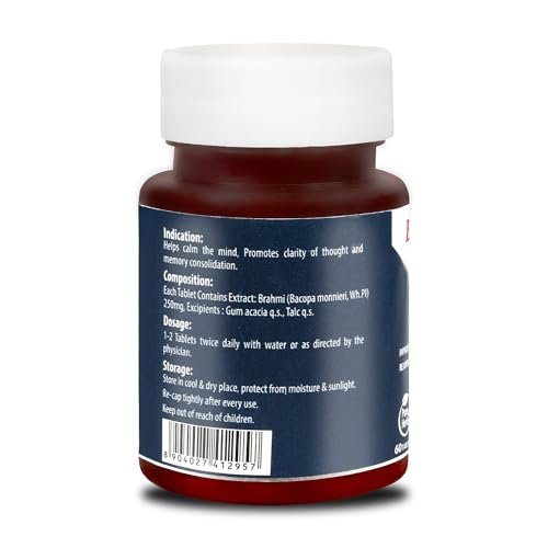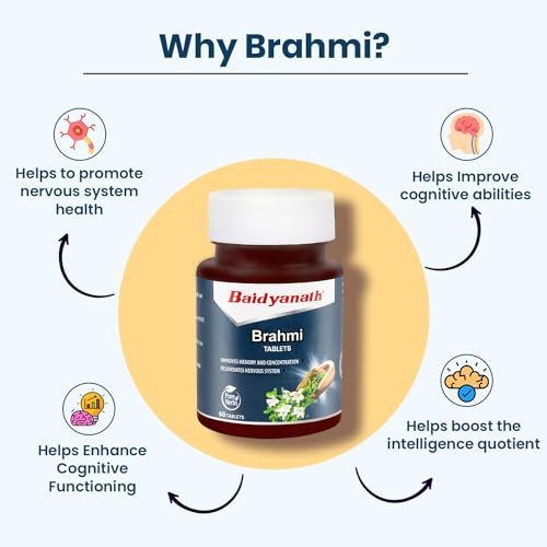 Baidyanath Brahmi Tablets | Enhancing Mental and Memory Health | Aids in Managing Daily Stress | Revitalizes Mind and Body. SOOTHES THE MIND – With its sleep-promoting properties, Brahmi facilitates restful slumber. NON-SEDATIVE FORMULA: Revered in Ayurveda as the herb of grace, Brahmi is a non-sedative and non-habit forming herb that soothes both body and mind. ENHANCES COGNITIVE FUNCTION: It is recognized for boosting cognitive abilities, alertness, and agility, which are essential for sustaining an active lifestyle.