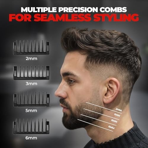 - Versatile Precision Combs: Attain your ideal appearance with four comb attachments (2mm, 3mm, 5mm, and 6mm). Whether you’re looking to trim your beard with precision, create intricate shapes, or style with finesse, this comprehensive tool provides unparalleled adaptability.
