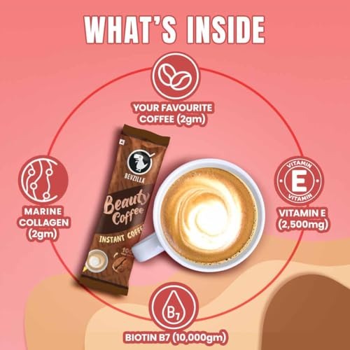 Bevzilla 30 Instant Beauty Coffee Infused with Marine Collagen, Biotin & Vitamin E Powder Sachets (30 X 5 Gram Sachets) Makes 30 Cups | 100% Arabica Coffee | Strong & Easy to Carry | Best for Espresso, Latte, Cappuccino – Fast Shipping to USA & Canada