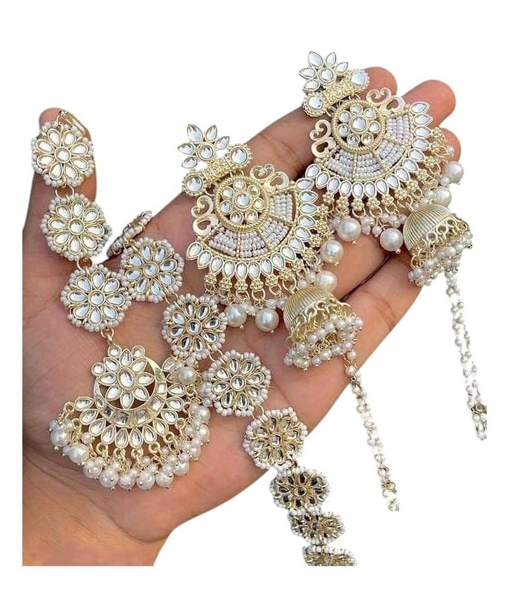 Embrace sophistication with this exquisitely designed 4-piece traditional jewelry set, tailored specifically for women and girls who wish to dazzle on any occasion. This stunning collection features 2 chic earrings, 2 coordinating ear chains, 1 elegant maang tikka, and 1 breathtaking matha patti ? everything you require to perfect your ethnic ensemble in one flawless package. Each item is meticulously crafted to harmonize traditional allure with contemporary grace. The earrings and ear chains beautifully frame your face, the maang tikka adds a touch of royal elegance to your forehead, and the matha patti enhances your overall look with a touch of regality. Whether you?re preparing for a wedding, festive gathering, or family celebration, this jewelry set will effortlessly elevate your appearance from ordinary to extraordinary. This collection is a genuine tribute to Indian artistry and cultural richness ? perfect for bridal attire, party ensembles, traditional events, and enthusiasts of ethnic fashion.