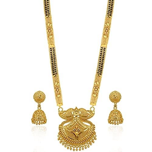 - Includes: 1 long mangalsutra measuring 30 inches, 1 short mangalsutra measuring 18 inches, and 1 pair of jumkha earrings.