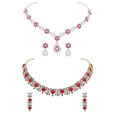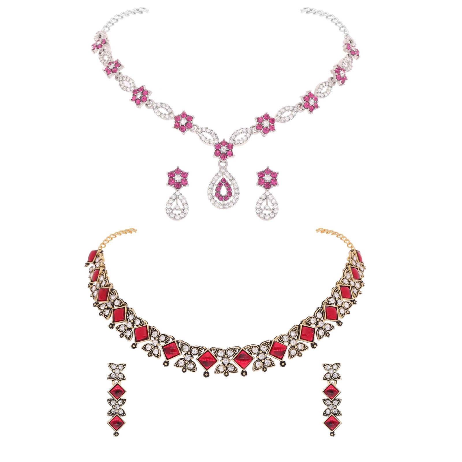 • Sales Offer: Set of 2 Choker Necklaces adorned with Gold and Silver Polish, embellished with AD Stones, accompanied by a matching pair of earrings.