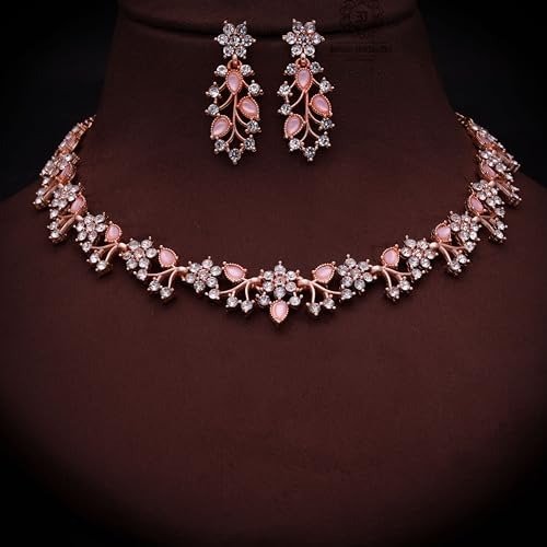 This exquisite jewelry ensemble includes a necklace and a pair of earrings. The rose gold-plated necklace features intricate detailing with artificial stones and is fastened with an S-hook closure. Accompanying it are matching drop earrings, each secured with a post and back closure.