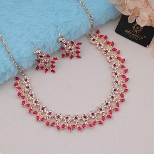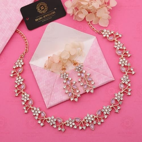 AD Studded Rose Gold Polished Necklace and Earring Set: Ideal for formal events, weddings, or an elegant dinner, this necklace and earring combination is designed to transform any outfit from mundane to magnificent. Whether adorned together or separately, each item exudes poise and sophistication, making it a perfect selection for the contemporary woman who values elegance and luxury.