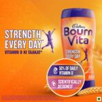 - Strength Every Day+ Bournvita is a meticulously formulated blend, developed by nutrition experts, containing a variety of nutrients recognized for their role in enhancing physical strength (Calcium, Vitamin D, and Magnesium are essential for maintaining bone and muscle health); mental resilience (Iron, Iodine, and Zinc contribute to normal cognitive functions); and immune support (Vitamin C, Vitamin D, Zinc, and Iron bolster immune system functions). Consequently, it promotes overall strength while delivering a significant energy boost.
