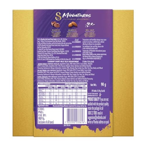 Introducing the indulgent Cadbury Dairy Milk Silk Miniatures, an exquisite assortment crafted to elevate your chocolate experience. Each box features a tantalizing selection of three delectable flavors: classic, almond and sea salt, offering a symphony of taste in every bite. With three pieces of each flavor, totalling 9 irresistible mini bars, this collection promises to delight your senses and satisfy your cravings. Whether it’s a heartfelt Rakhi gift for your sibling, a sweet surprise for a loved one’s birthday, or a festive treat for Diwali spent with family, these miniature delights are the perfect way to spread joy and sweetness on any special occasion. Indulge in the luxurious taste of Cadbury Dairy Milk Silk Miniatures and make every moment memorable with a touch of sweetness.