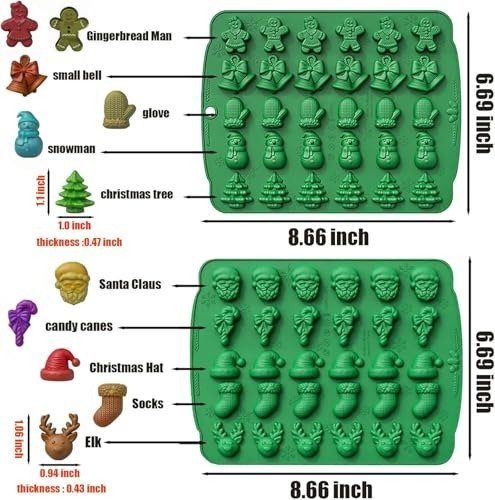 - Dimensions: The Christmas chocolate mold measures 8.66 x 6.69 x 0.6 inches overall. Individual shapes include: gingerbread man at 1.22 x 0.98 inches, Christmas bell at 1.22 x 1.1 inches, mitten at 1.02 x 0.87 inches, snowman at 1.18 x 0.79 inches, Christmas tree at 1.18 x 1.06 inches, Santa Claus at 1.19 x 0.87 inches, Christmas hat at 1.3 x 0.87 inches, stocking at 1.18 x 0.59 inches, reindeer at 1.38 x 0.91 inches, and candy cane at 1.34 x 0.67 inches.