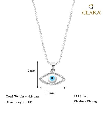 This pendant necklace features a chain crafted from genuine 92.5% sterling silver, with a 925 stamp on each piece. The Swiss zirconia used in this design is as dazzling as a diamond; the brilliance of our specially cut zirconia closely resembles that of real diamonds, making it nearly impossible for even experts to distinguish between the two with the naked eye. A durable rhodium plating, 2 microns thick and free of nickel, ensures a lasting shine. The product is elegantly presented in a sophisticated gift box, accompanied by a CLARA Authenticity Card. Additionally, the evil eye stone incorporated into the design serves as a protective charm against bad luck.