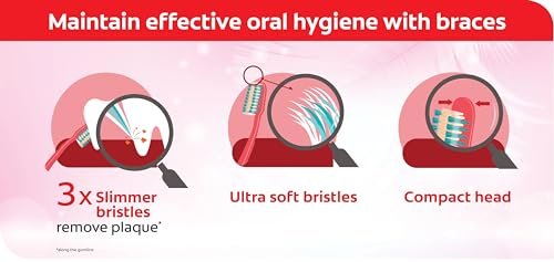 Slim head and shaped bristles clean teeth and braces thoroughly.