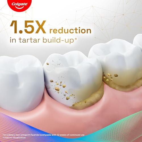 Colgate Total Anti-Tartar Toothpaste offers 1.5 times more effective tartar reduction compared to standard non-antimicrobial fluoride toothpaste after 12 weeks of consistent use. This anti-germ formula addresses the underlying issues of cavities, plaque, tartar, sensitivity, enamel erosion, stains, bad breath, and gum concerns.