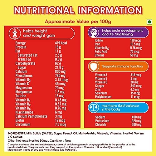 Complan is a dairy-based beverage mix specifically formulated to fulfill the nutritional requirements of growing children. Its Creamy Classic Flavor offers a tasty and nutritious drink that your child will love. Packed with essential nutrients, it includes 100% milk protein, crucial for their growth. Complan boasts 63% more protein (on a per 100g and per serving basis) compared to standard malt-based food drink powders. With a blend of 34 vital nutrients, such as Vitamin D2, calcium, and zinc, it is crafted to promote overall growth and development. Clinical studies have shown that Complan supports growth at twice the rate and enhances memory and concentration. This nutritional drink is rich in essential elements like iodine, iron, and zinc, which are known to aid in brain development and function. Additionally, pro-immunity nutrients like Vitamin A and Vitamin C bolster immune health. For optimal benefits, serve this delightful drink twice daily (33g x 2) as part of your child’s balanced diet. It can be enjoyed in two delightful forms: hot or cold. Provide your child with the nutrition they need with Complan.