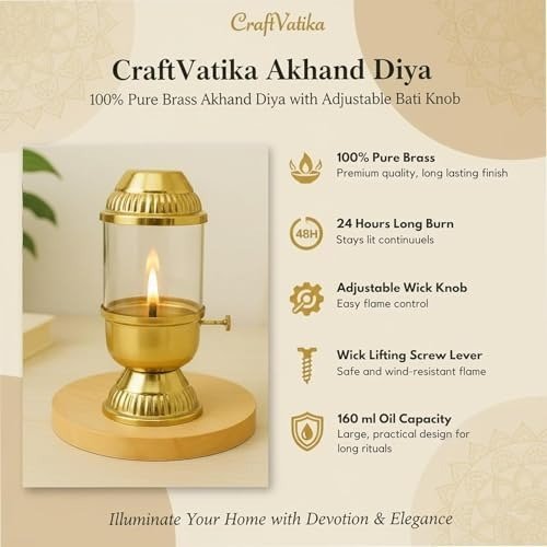 CraftVatika 100% Pure Brass Akhand Diya with Adjustable bati Knob, Wick Lifting Screw Lever, Glass Cover (Large Size, 160 ml Oil Capacity, Stay Lit Upto 24 Hours, Diya for Pooja,Long Burning Oil Lamp – Fast Shipping to USA & Canada