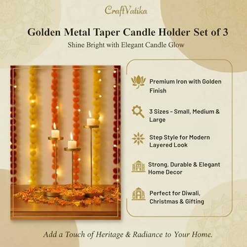 • Opulent Gold-Tone Accent for Sophisticated decor: Expertly fashioned from premium iron and adorned with a lustrous gold coating, these candle holders infuse any space with refined charm. Their classic silhouette suits both special celebrations-such as Diwali, Navratri, and Christmas-and daily interior styling. Built to last, the robust metal structure preserves both brilliance and durability over time, ensuring these pieces remain a lasting addition to your decor collection.