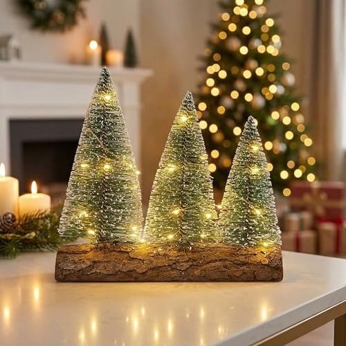 This elegant set features three artfully crafted bottle-brush trees, each anchored on a charming wooden base. The high-quality fibers, adorned with sparkling gold glitter and a frosted coating, create a sophisticated holiday ambiance-ideal for contemporary living spaces, inviting nooks, office workstations, or as a thoughtful Christmas gift. - Integrated LED Illumination for a Cozy & Enchanting Holiday Ambience:
