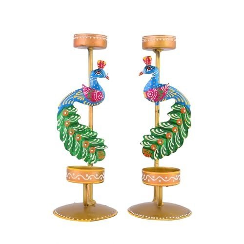 CraftVatika Metal Peacock Candle Holder Set of 2 – Perfect House Decoration Diwali Gifting Items, Handpainted Tealight Candle Holders for Home Christmas DECOR (21.5 CM Height) – Fast Shipping to USA & Canada