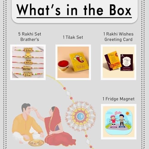 • Rakhi Combo Set Includes (8 Items): 5 High-Quality Kids? Rakhis for Brother, 1 Greeting Card with Best Wishes, and 1 Refrigerator Magnet.