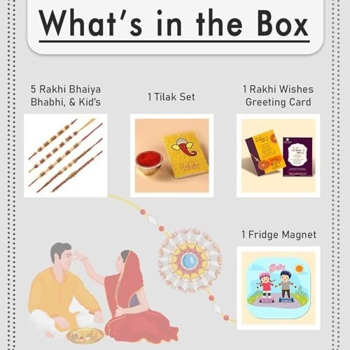 • Rakhi Combo Set Includes (8 Items): 5 High-Quality Kids? Rakhis for Brother/Bhaiya, 1 Greeting Card with Best Wishes, and 1 Refrigerator Magnet.