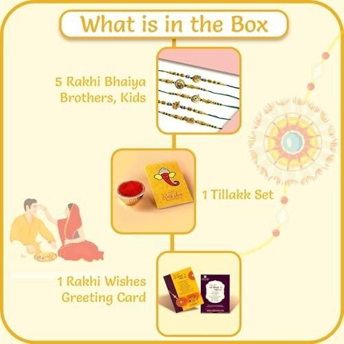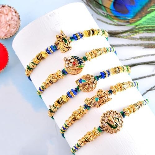 – 5 High-Quality Rakhis (featuring: 1 Designer Krishna Rakhi for Brother, 1 Premium Radhe Krishna Rakhi for Younger Brother, 1 Krishna Flute-Themed Rakhi for Bhaiya, 1 Om Ganesha Rakhi for Bhai, and 1 Peacock Feather Rakhi for Bhaiya)