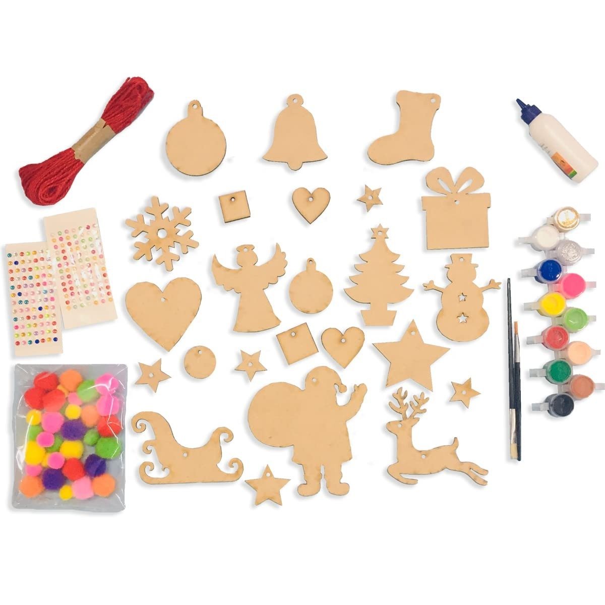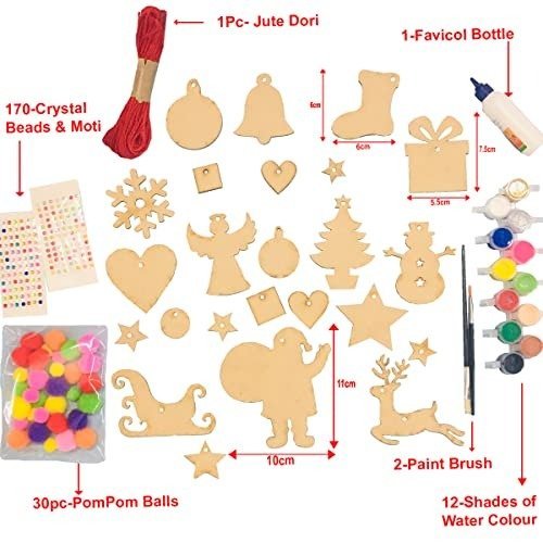 • This box includes: 1 set of MDF Christmas ornament cutouts (24 pieces), 1 pack of paints (12 colors), 1 set of paintbrushes (2 pieces), 1 pack of crystal beads (90 pieces), 1 pack of half pearls (80 pieces), 1 pack of pom-pom balls (30 pieces), 1 tube of Fevicol adhesive, and 1 thread.