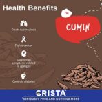 - CRISTA Cumin (Jeera) is of superior quality, featuring a robust flavor and a brownish-grey hue.