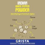 - CRISTA White Pepper is of the highest quality, sourced naturally and sun-dried from India. It features a greyish-white hue and contains a high concentration of volatile oils that intensify its peppery flavor.