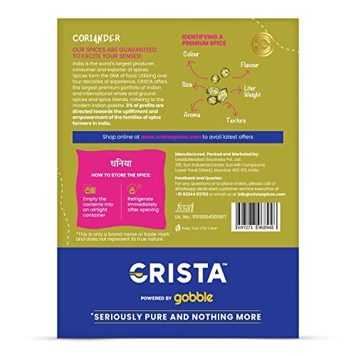 - CRISTA Coriander is of premium quality, featuring a robust and sweetly aromatic profile.