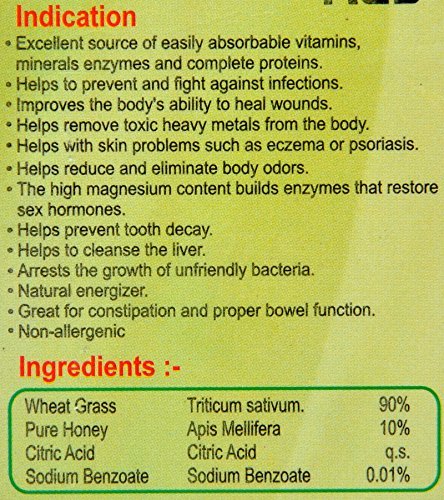 - Primary Components: Wheatgrass, Honey