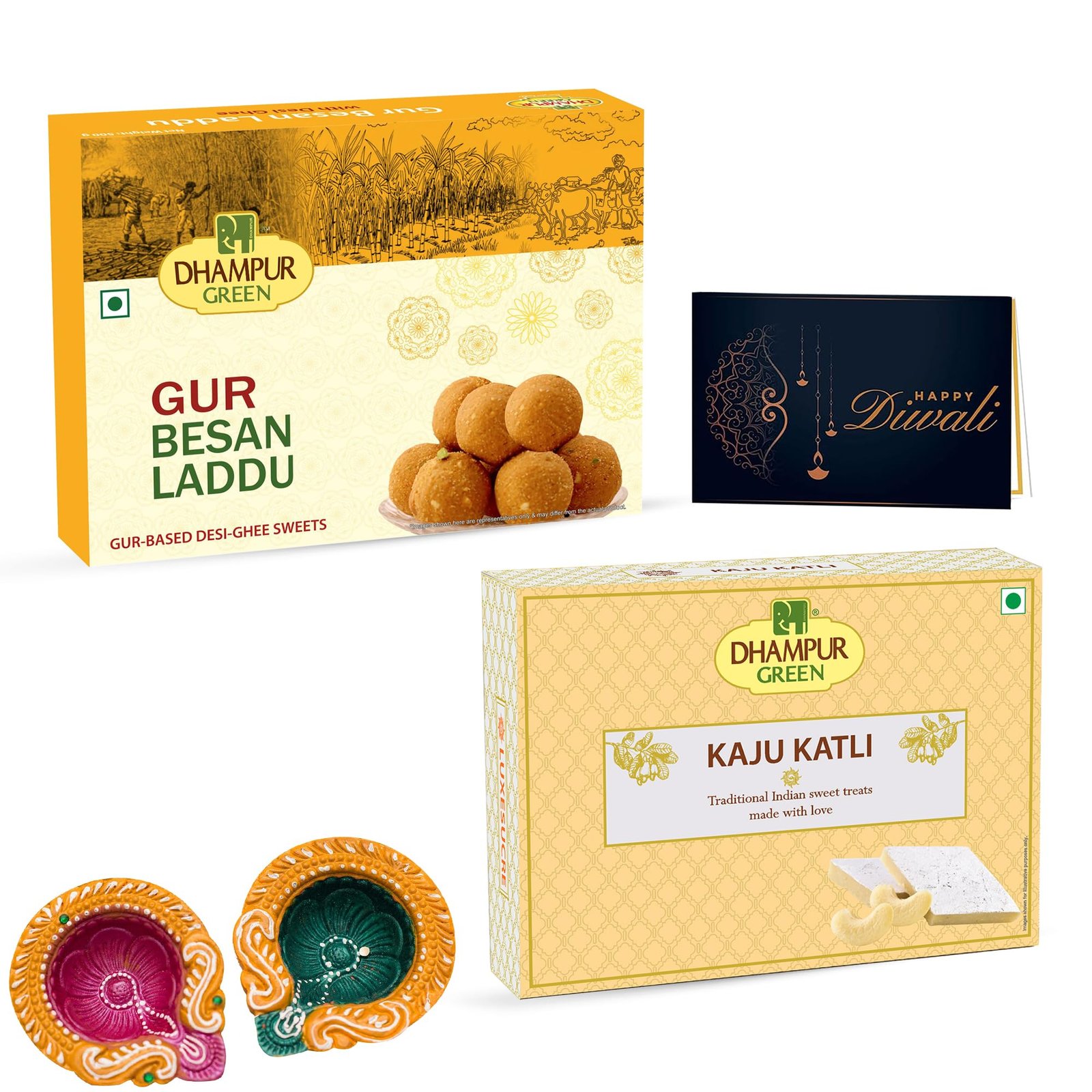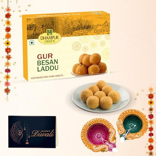 Dhampurgreen Gur Besan Laddu Diwali Sweets Gift Hamper,1 Diya & Greeting Card – Indian Sweets | Mithai | Gift, 900grams – Fast Shipping to USA & Canada