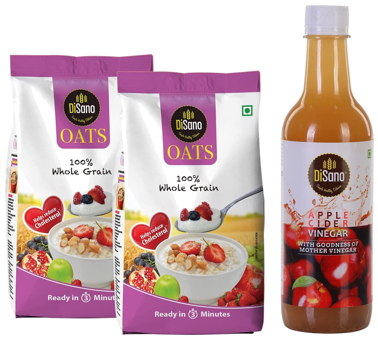 Disano Oats, 100% wholegrain, Pouch 2 kgFor a great start of morning Disano oats is a perfect choice for the whole family. Disano oats is made from 100 % wholegrain oats, which is a natural source of protein, and dietary fibre. It helps reduce the risk of high blood pressure and cholesterol. It take quick 3 minutes to prepare a tasty meal with Disano oats you can make lot of healthy recipes with Disano oats for breakfast, lunch or dinner & boost the nutritional value without compromising on taste.DiSano Apple Cider Vinegar With Mother Vinegar 500 mlApple cider vinegar is naturally brewed from the delicious Himalayan apples and contains strands of ‘Mother: A proof of unfiltered vinegar.
