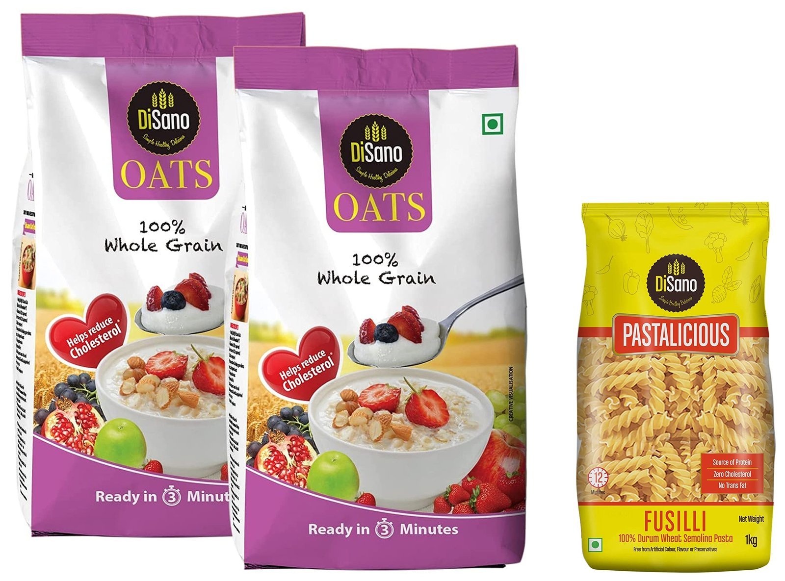 Disano Oats, 100% wholegrain, Pouch 2 kgFor a great start of morning Disano oats is a perfect choice for the whole family. Disano oats is made from 100 % wholegrain oats, which is a natural source of protein, and dietary fibre. It helps reduce the risk of high blood pressure and cholesterol. It take quick 3 minutes to prepare a tasty meal with Disano oats you can make lot of healthy recipes with Disano oats for breakfast, lunch or dinner & boost the nutritional value without compromising on taste.DiSano Pastalicious 100% Durum Wheat Fusilli Pasta, 1kgDisano pastalicious pasta, crafted form the finest durum semolina into mouth-watering and nutrition meals which take just 12 minutes to prepare. With a low glycine index low cholesterol and high levels of fibre, its no wonder that pasta is the foundation of the Mediterranean diet, a healthful diet dominated by grains, fruits, vegetables and olive oil from deliciously simple feasts, Disano pasta is the perfect choice.